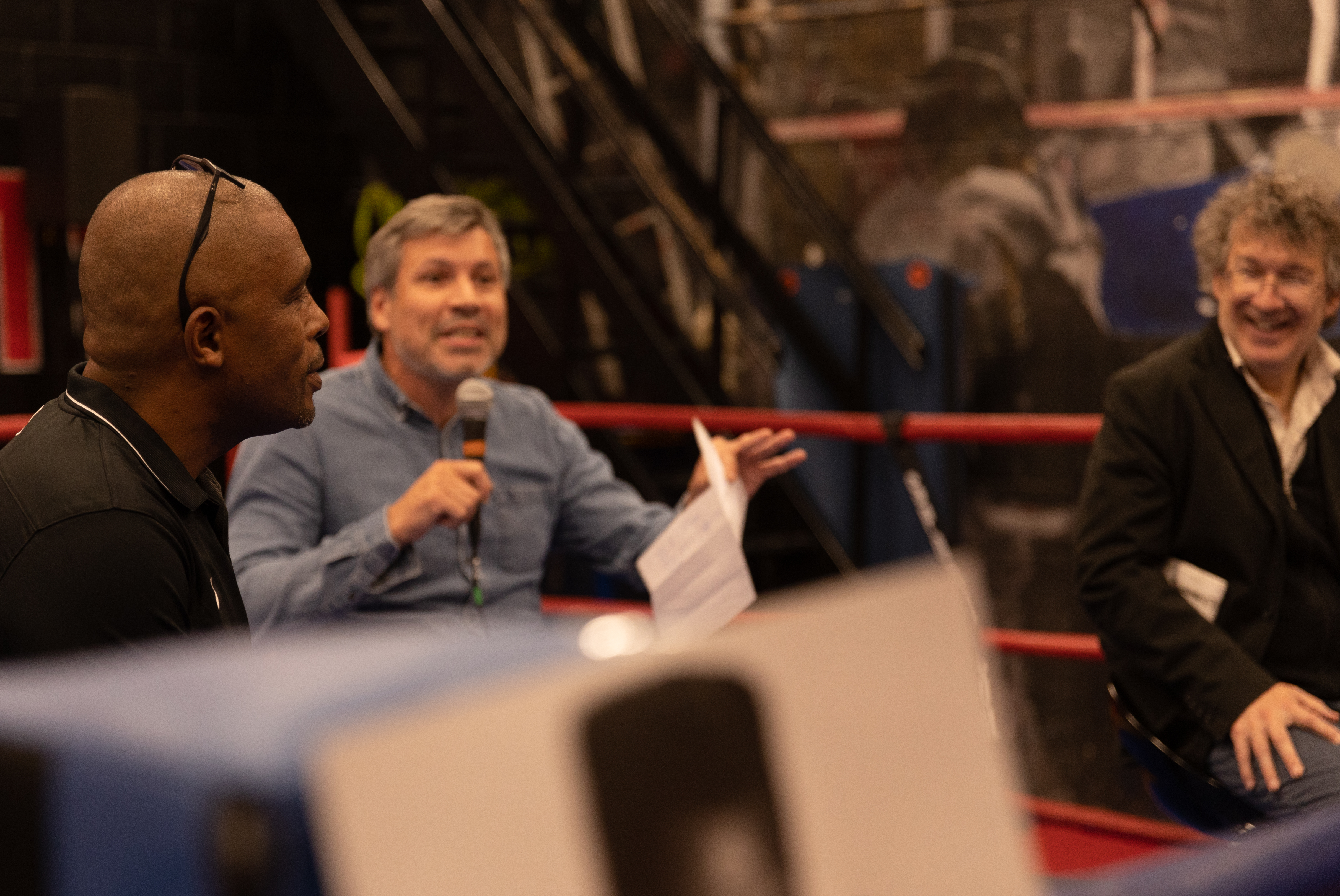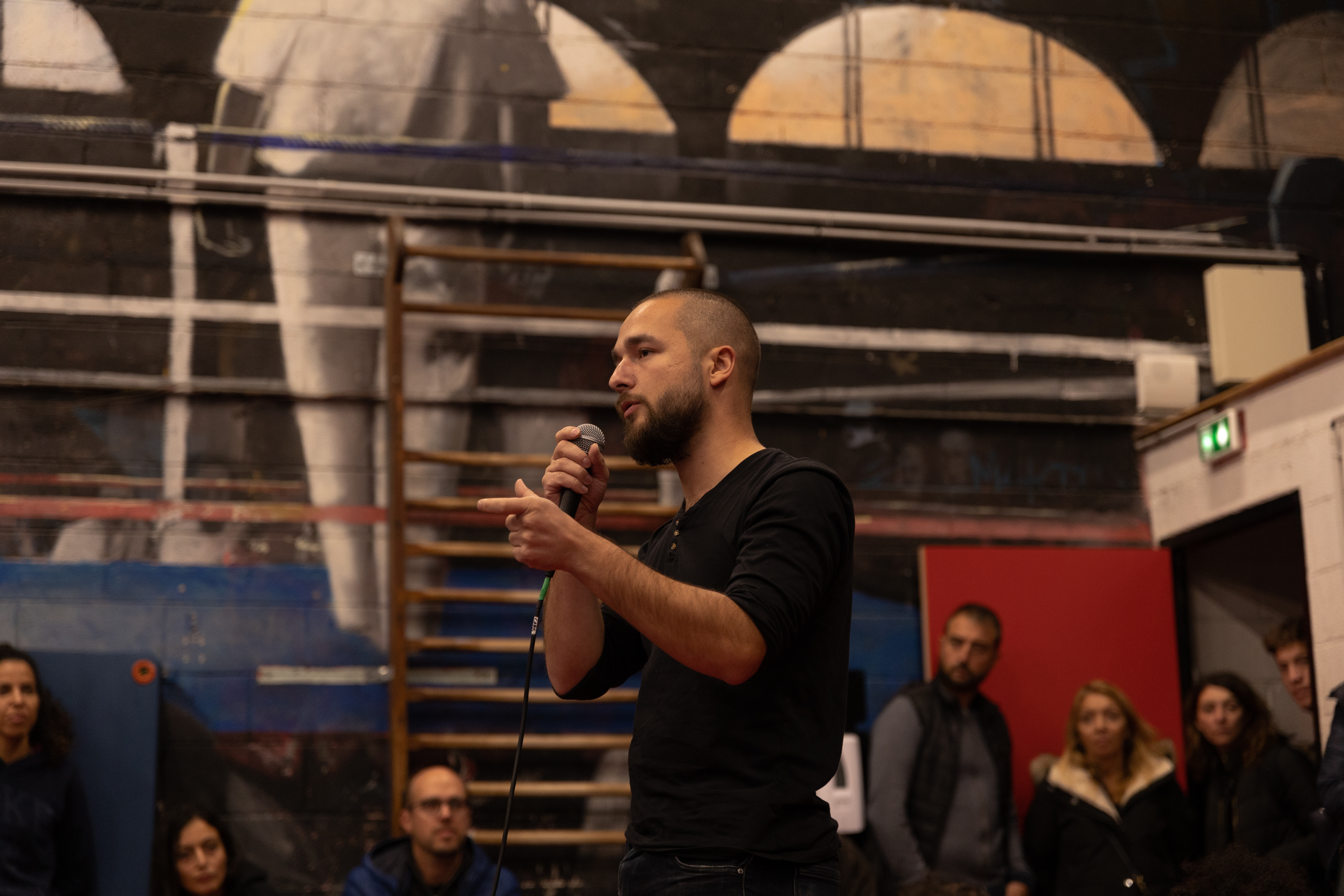 La lecture de ce livre nous a donné envie de faire vivre une expérience immersive à Loïc et nos invités en les plongeant dès leur arrivée au Boxing Beats en plein coeur d’un entraînement de nos athlètes: le public présent a pu découvrir ce que constitue la préparation d’un boxeur mais aussi ressentir l’atmosphère particulière d’une salle de boxe en action, rythmée par les directives du coach, les bruits des coups qui cognent, les cris, les rires et la sueur.